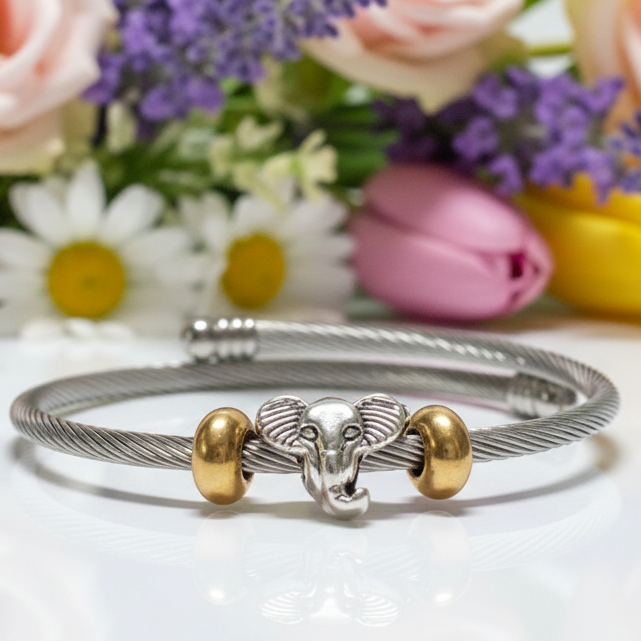 Elephant Stainless Expandable twisted Steel Bracelet Glass Charm Bead. Easy to put on adjustable stretch memory wire. One size fits most