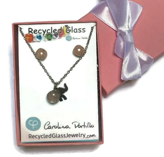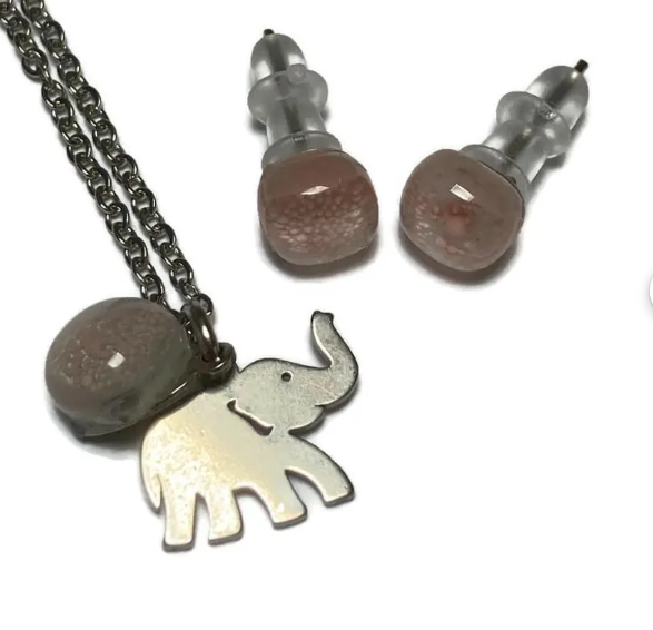 Elephant themed set. Post studs earrings and pendant. Recycled Fused glass pendant. Handmade bead. Hypoallergenic steel.
