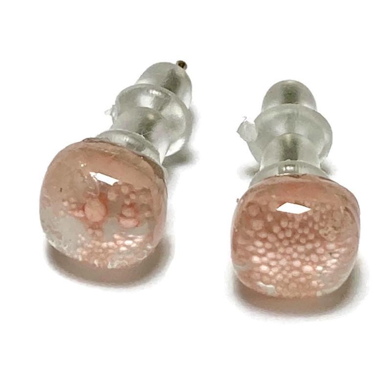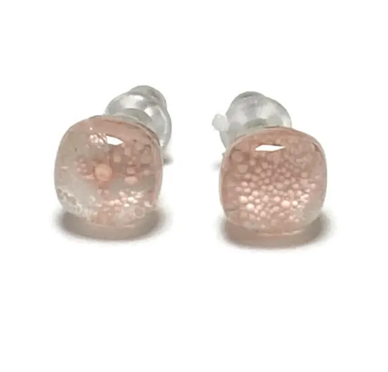 The glass bead is very small. In fact, the glass glass cannot be cut smaller. The glass in cut in squares and corners rounded during the firing. Approx. 0.2" each side. All my pieces are handmade. Blue small bubbles.