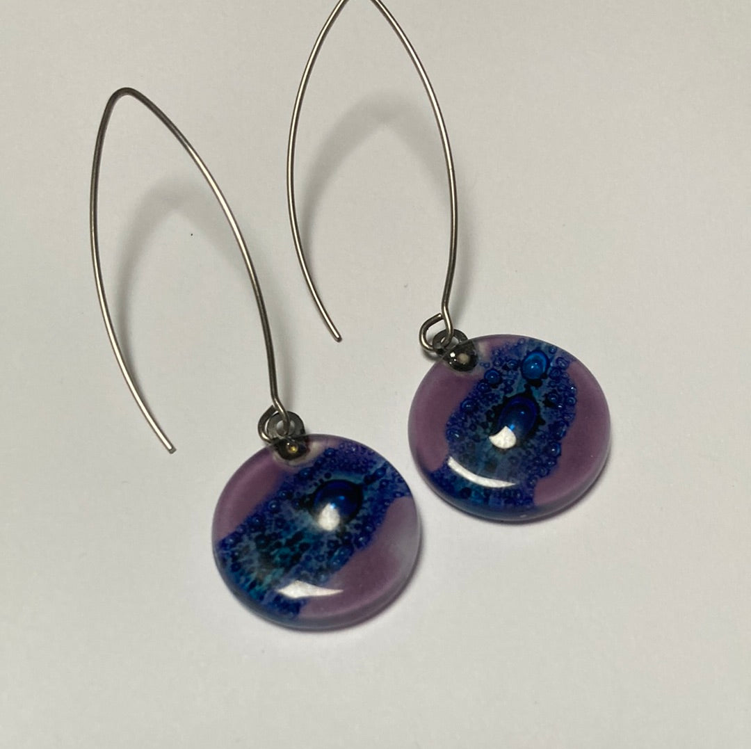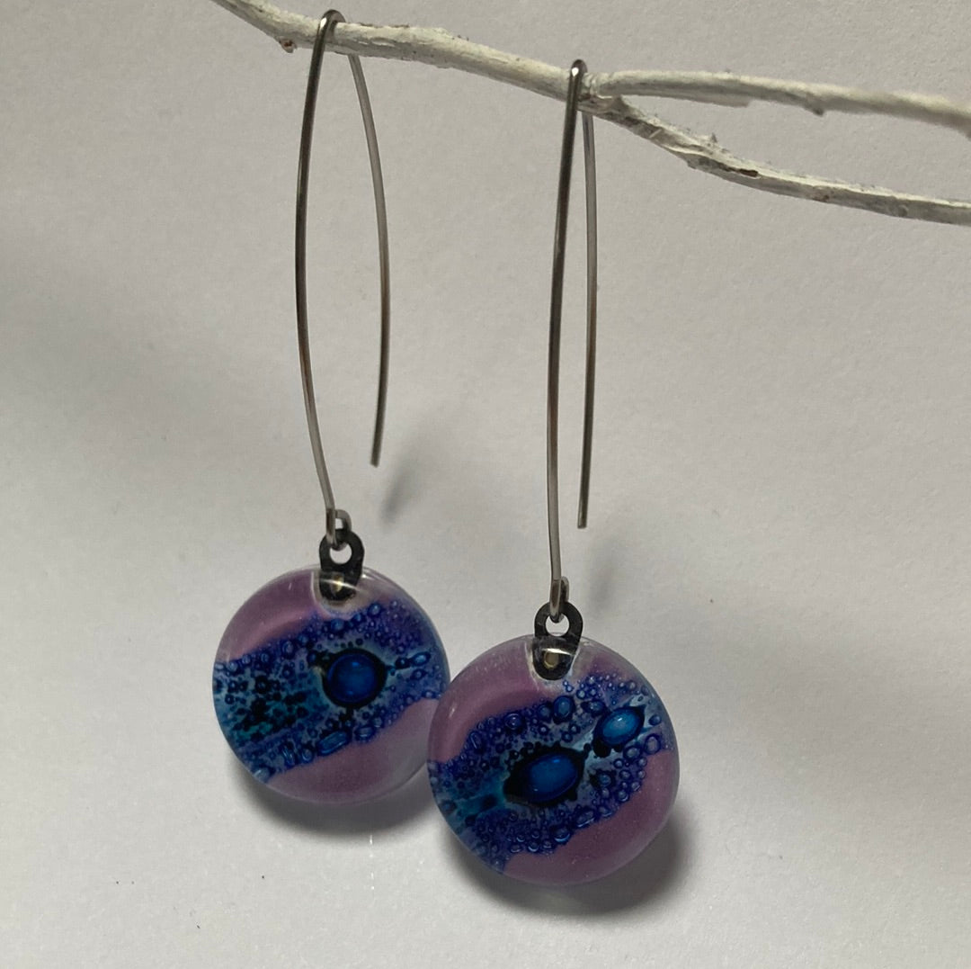 Long fused glass dangle drop earrings. Elegant open oval wire with handmade in lilac and blue recycled glass beads.