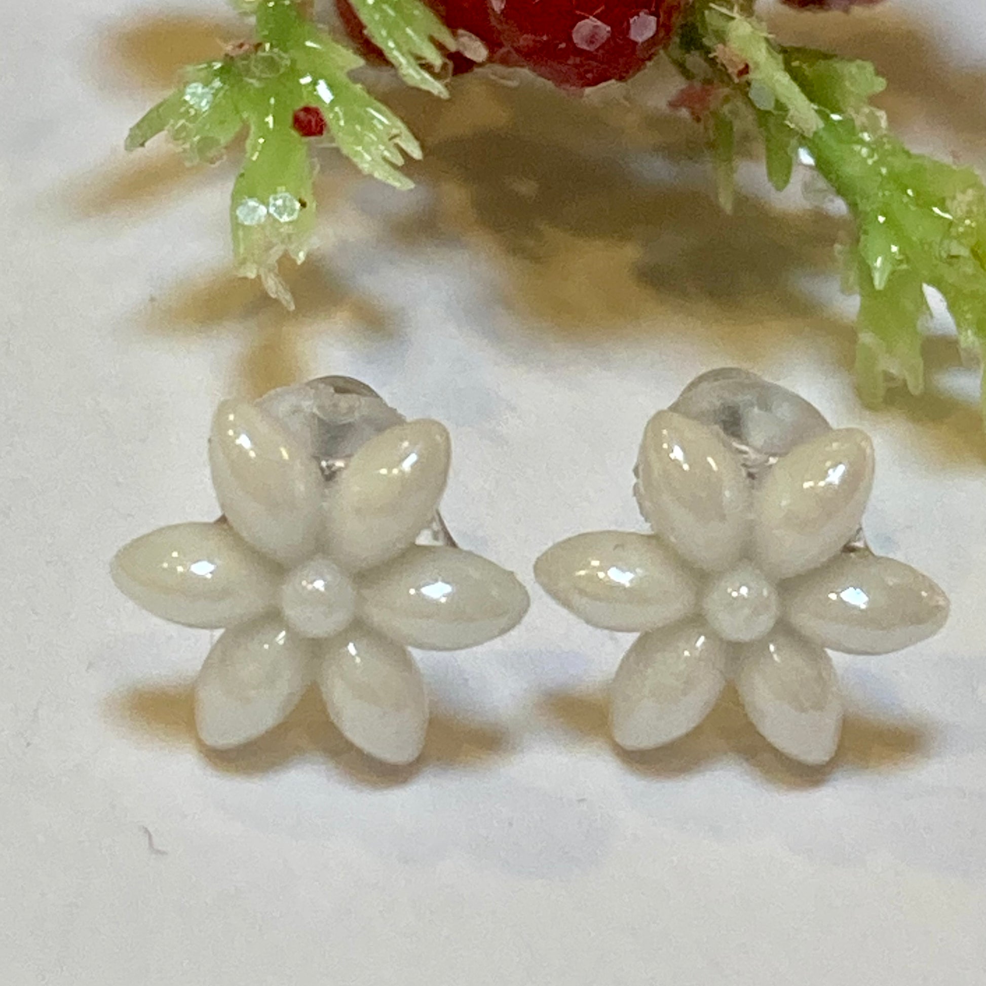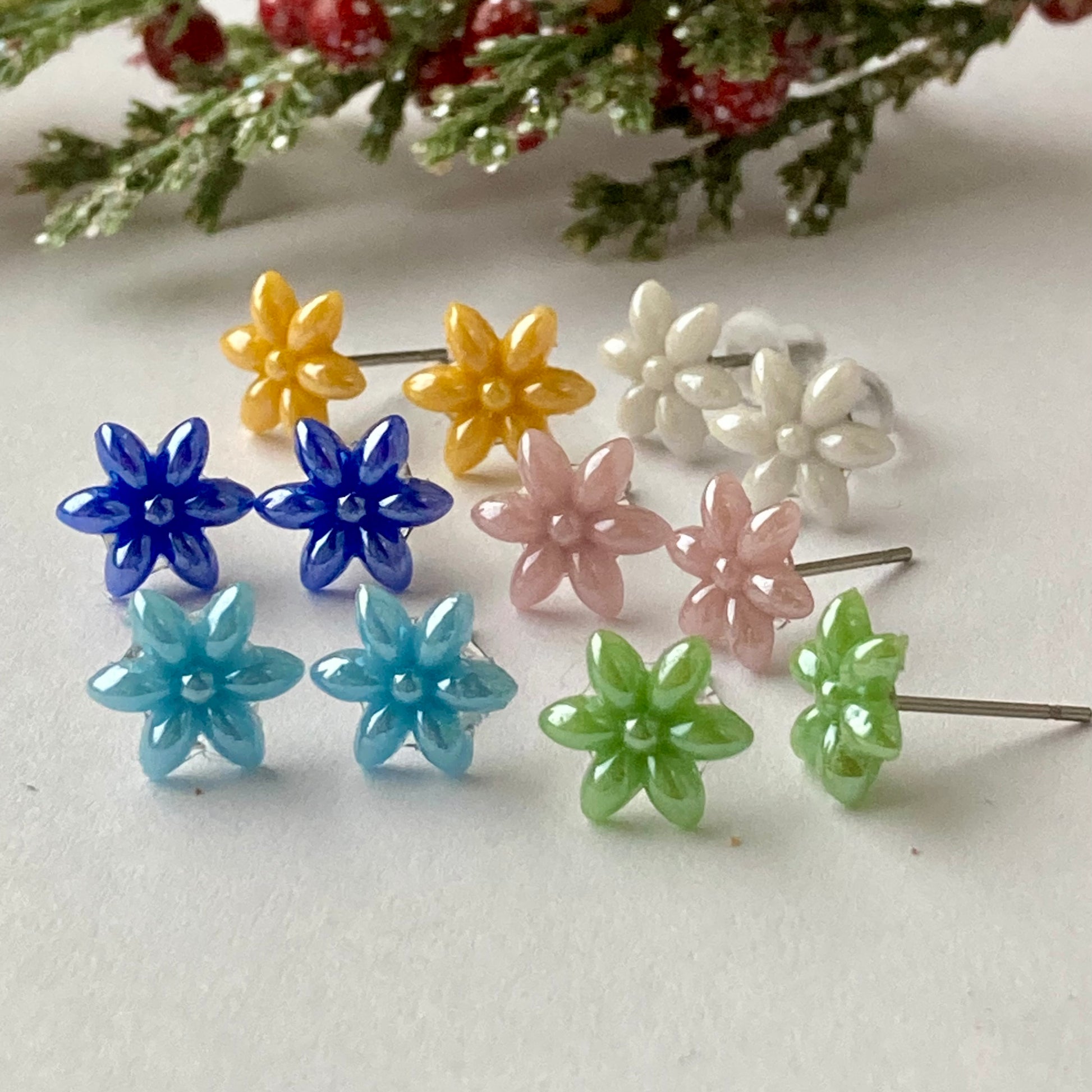 Iridescent glazed mini tile flower stud earrings. Size is approximately 10mm x 10mm x 2mm. Hypoallergenic steel post.