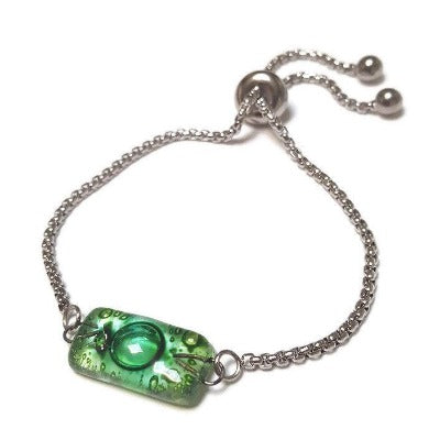 Green Stainless Steel Box Chain Slider Bracelet. Minimalist, Dainty, Pull Tie bracelet. Adjustable slider bracelet with recycled glass charm