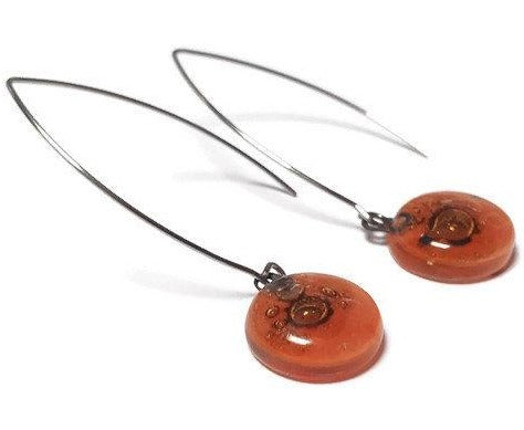 Long fused glass dangle drop earrings. Elegant open oval wire with handmade in pale red and brown recycled glass beads.