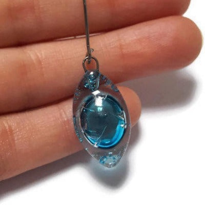 Long open oval V drop earrings. Blue recycled glass drop dangles.
