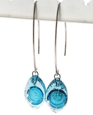 Long fused glass dangle drop earrings. Elegant open oval wire with handmade in Aqua turquoise recycled glass beads.