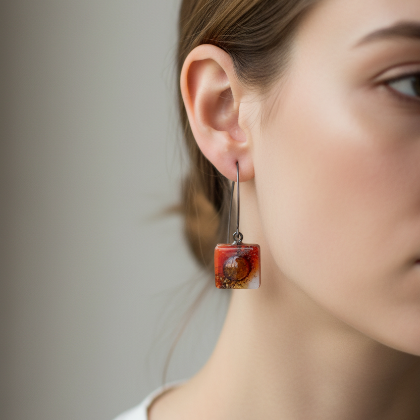 Welcome to Recycled Glass Jewelry. We use window glass (float glass), cut, shaped, polish and hand-painted with glass powder paints. The glass layers are stacked one on top of the other and placed in the kiln. During the firing when the glass reaches the right temperature, the layers melt together becoming a one of a kind creation. The bubbles give each piece uniqueness and character. It is always fun to open the kiln and see the results! Eco designed jewelry!