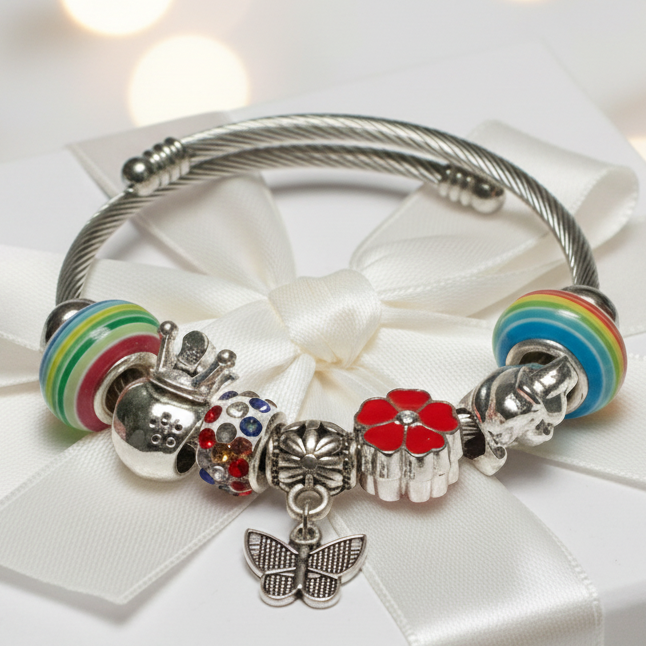 Color Theme: Rainbow, red flower, butterfly, love heart and teddy bear charms.