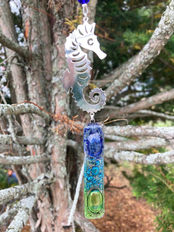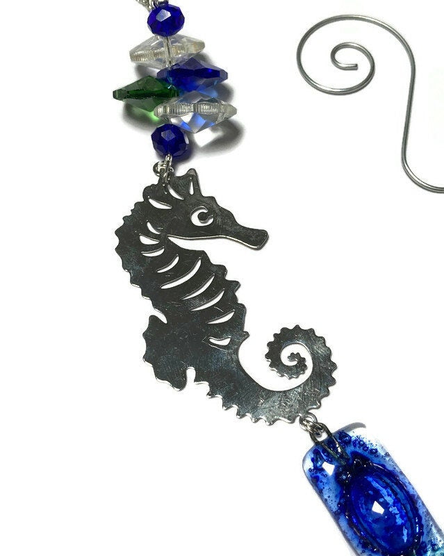 Recycled Fused Glass Seahorse Hanging ornament. Super cute window/wall hanging decoration ornament made with repurposed materials.