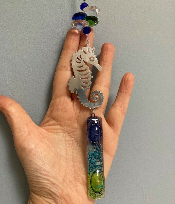 Seahorse hanging decoration. Hand made fused glass ornament. Colorful home decor. Beach