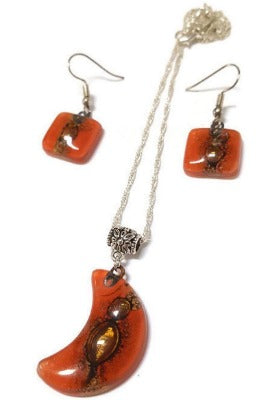 Set earrings and Moon pendant. Red and brown Recycled Glass. Handmade