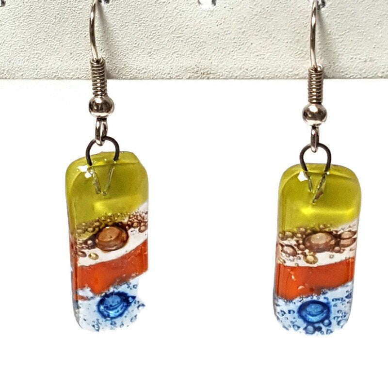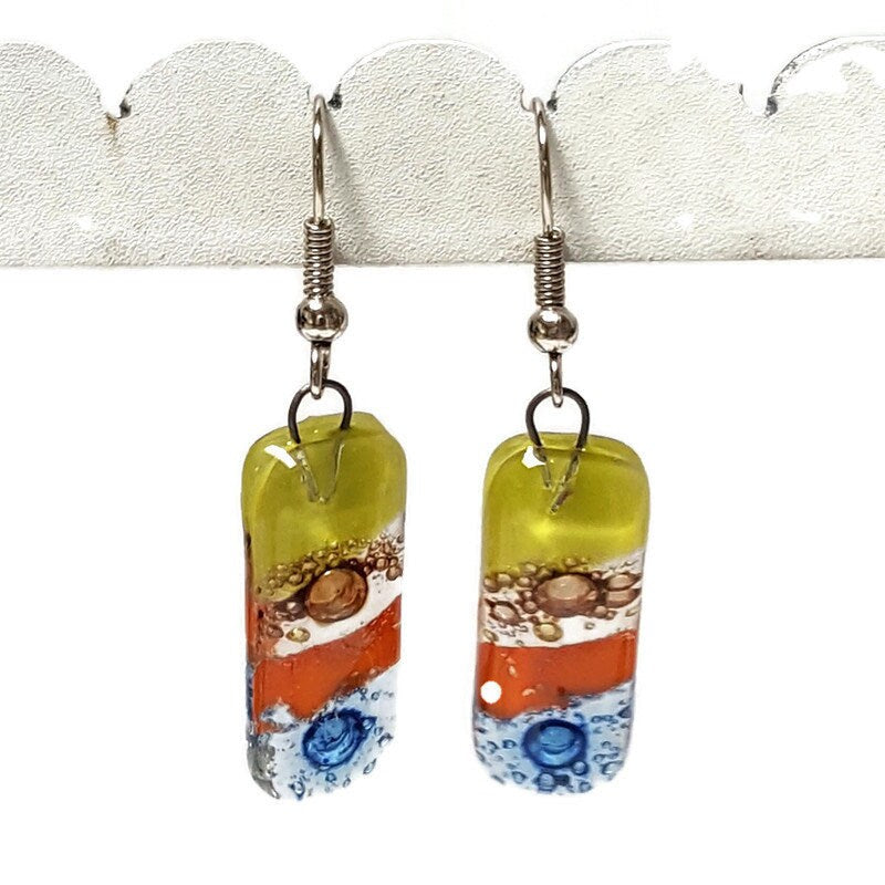 Small bar rectangle Dangle Earrings Recycled Glass. Fused drop Glass blue, brown, light green and orange coloful drop earrings.