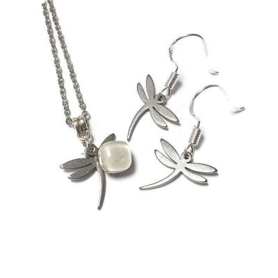 Small Dragonfly set. Drop earrings and necklace. Recycled fused glass white. Minimalist, tiny and ecofriendly. Dainty