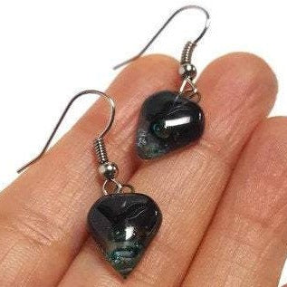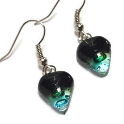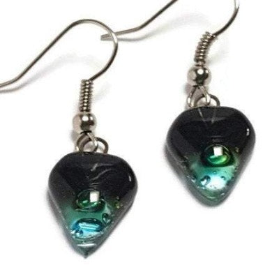 Small turquoise, green and black Earrings. Heart Shape Recycled glass Jewelry. Fused glass