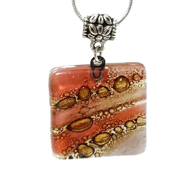 Square small Pendant. Handmade Red, Pink and Brown Recycled Fused Glass Necklace. Dainty colorful necklace. Everyday Pendant. handcrafted