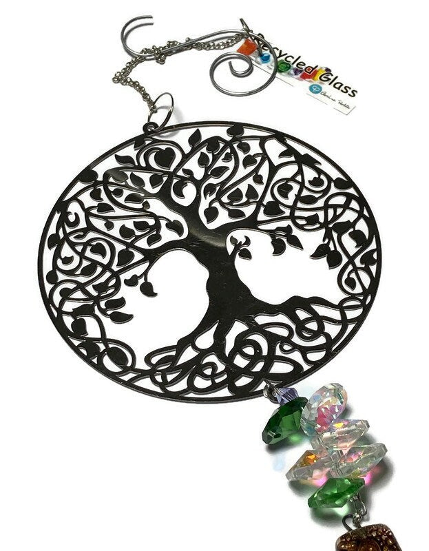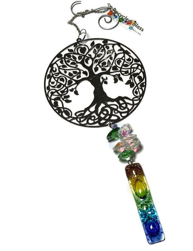 Recycled Fused Glass Tree of life hanging ornament. Super cute window/wall hanging decoration ornament made with repurposed materials.