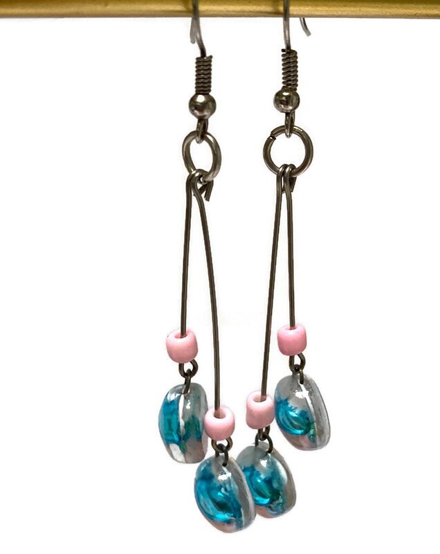 The glass beads are about .35'' in diameter and the earrings are 2.75 (including hook)