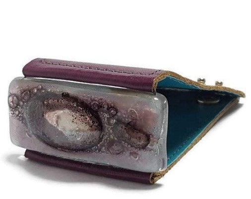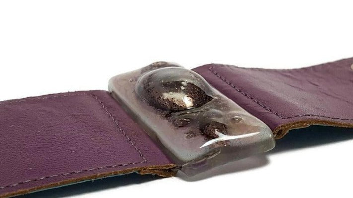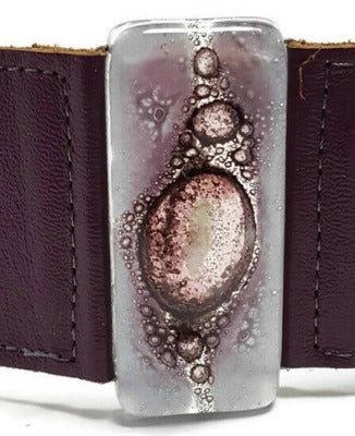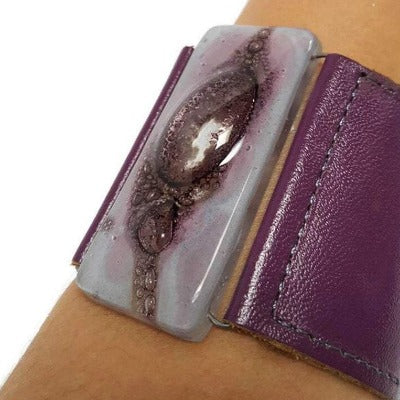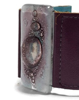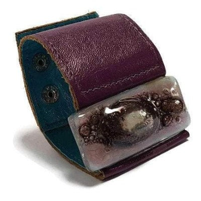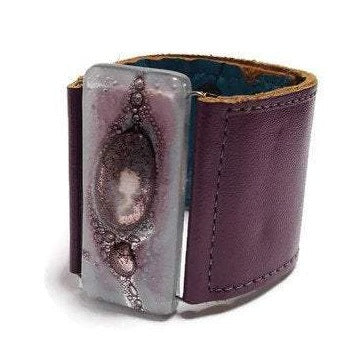 Glass and leather. Lavender lilac with Purple Leather Cuff. Recycled fused Glass wide bracelet