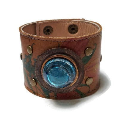 Floral Reclaimed Leather Wide Cuff Bracelet. Fused Glass and Leather Wrist band. Unique eco fashion jewelry, Turquoise glass bead w bubbles!